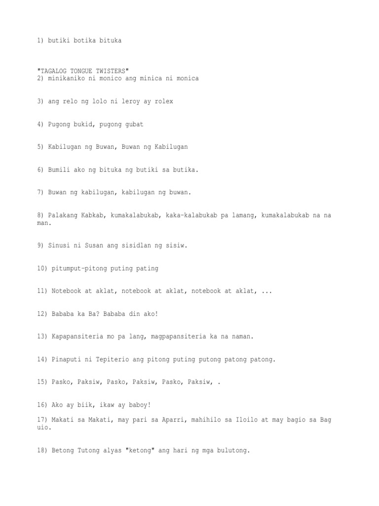 Minikaniko ni Monico ang makina ni Monica 2. Pugong bukid, pugong gubat 3. Kabilugan ng Buwan, Buwan ng Kabilugan 4. Butiki, bituka, butika 5. Buwan ng kabilugan, kabilugan ng buwan. Palakang Kabkab, kumakalabukab, kaka-kalabukab pa lamang, kumakalabukab na naman. Sinusi ni Susan ang sisidlan ng sisiw. Pitumput-pitong puting pating 9. It’s round in the stern and blunt in the front. Mrs Puggy Wuggy has a square cut punt. Six stick shifts stuck shut. Rubber Baby Buggy Bumpers. Similar Posts: Tongue Twisters For Kids, Tongue Twisters In Hindi, Tongue Twisters In English.